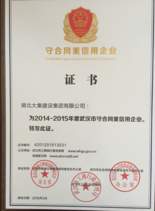 2016年7月21日上午,武漢市工商行政管理局委托蔡甸區(qū)工商管理局領(lǐng)導向湖北大集建設(shè)集團有限公司董事長徐濤頒發(fā)2014-2015年度“守合同重信用企業(yè)”榮譽證書,我公司已連續(xù)十二年榮獲此項殊榮!