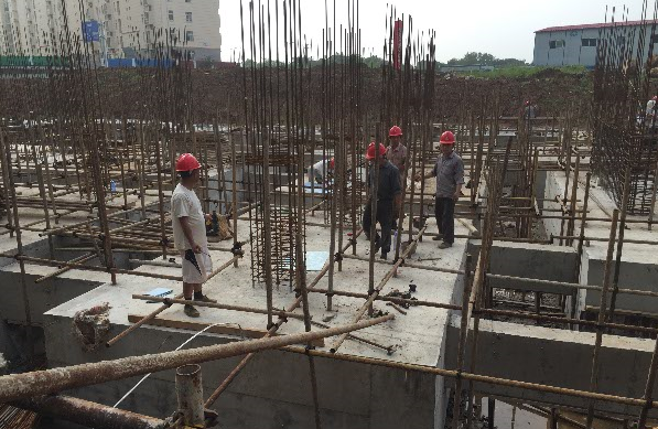 現(xiàn)場指揮部總指揮謝總工帶我們參觀了現(xiàn)場并大概介紹了各個棟號施工進度等方面的情況。我們首先進入16#樓施工現(xiàn)場,該棟號的項目經(jīng)理徐斌親自現(xiàn)場督促,施工現(xiàn)場緊鑼密鼓的進行基礎(chǔ)承臺柱墻的鋼筋綁扎工作。剛剛完成的現(xiàn)澆混凝土承臺及承臺梁整體觀感好,整潔干凈、規(guī)范美觀。據(jù)謝總工介紹施工人員在混凝土澆筑時,先攤平振搗密實,然后用抹子抹平,緊接著再用掃帚在已抹好的面層上輕輕掃一遍,再用薄膜覆蓋住才能達到好的效果。承臺上正在綁扎鋼筋的墻柱,每個樣板上都張貼著相應(yīng)的構(gòu)件尺寸及鋼筋信息,便于檢查核對和施工操作,體現(xiàn)出該工程現(xiàn)場施工人員嚴謹認真的工作態(tài)度。