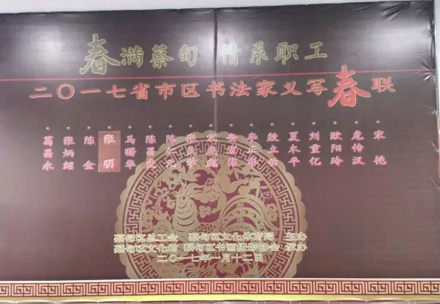 元月12日上午,在雞年新春即將來臨之際,蔡甸區(qū)總工會(huì)組織省市區(qū)書法協(xié)會(huì)書法家在區(qū)總工會(huì)工人活動(dòng)中心開展《春滿蔡甸·情系職工》2017省市區(qū)書法家義寫春聯(lián)、送祝福活動(dòng)。區(qū)總工會(huì)、文體局相關(guān)領(lǐng)導(dǎo)、省市區(qū)著名書法家張良學(xué)、陳昌虎、宋成彪等出席了此次活動(dòng),集團(tuán)公司人事行政部吳志勇、周仟應(yīng)邀參加了該活動(dòng)。