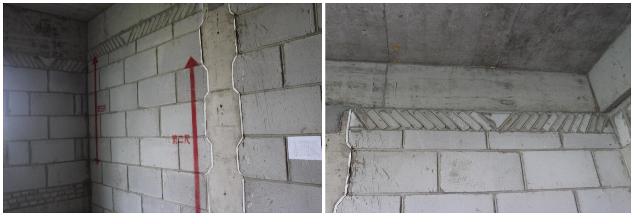 磚砌體及二次結構:1、灰縫均勻、密實、光滑;2、馬牙槎呈45度,邊口粘貼雙面膠,且二次結構混凝土結口密實,無蜂窩麻面,無漏漿現(xiàn)象;3、頂部斜砌體灰縫密實,角度合乎規(guī)范要求(45度-60度);斜砌體交接處用三角砌體砌筑,使結構穩(wěn)定,起到防裂作用。4、墻體垂直、平整度合規(guī),排版放樣合規(guī);