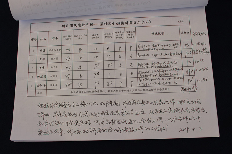 新版項目績效考核制度發(fā)布后,項目經(jīng)理周勝書立即組織自己帶領的項目成員對考核制度進行集中學習,讓項目人員全面了解制度內(nèi)容。此外,周經(jīng)理還深入研究考核指標及內(nèi)容,并以其為標準,結合自身項目的實際情況制定了項目團隊績效考核表,從崗位職責、考勤打卡、施工日記、團隊配合等方面對項目人員進行考核,并讓項目員工嚴格執(zhí)行目標管理卡,對當月的工作任務進行量化,確保項目人員工作時有目標、有責任、有動力。