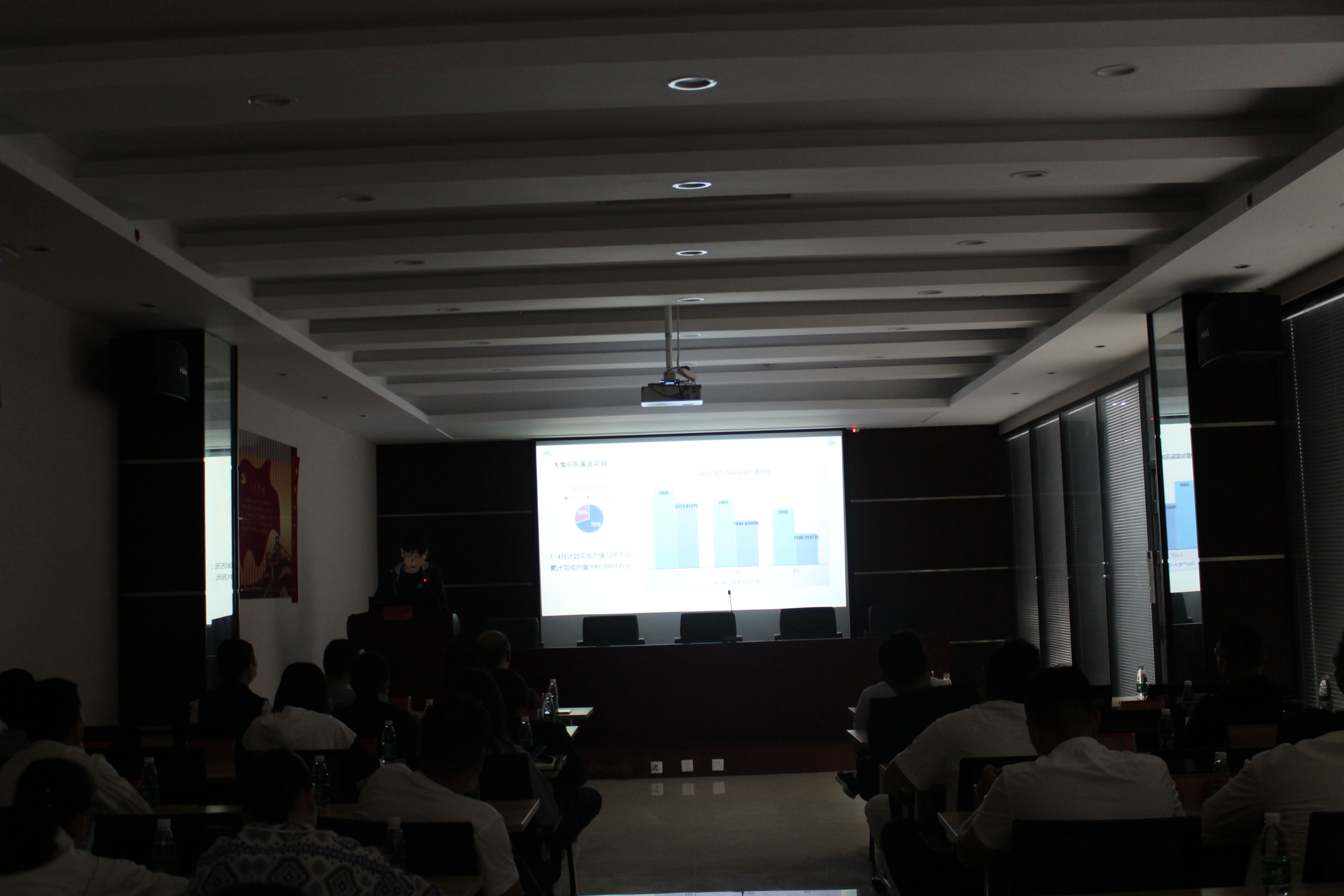 工程部質(zhì)檢員鄧文俊以數(shù)據(jù)說(shuō)話,通過(guò)清晰明了的柱狀圖、餅狀圖對(duì)比,向大家匯報(bào)了截至4月底,集團(tuán)公司總產(chǎn)值完成情況以及各項(xiàng)目產(chǎn)值完成情況及進(jìn)度,并逐一分析了各項(xiàng)目產(chǎn)值未完成的原因。