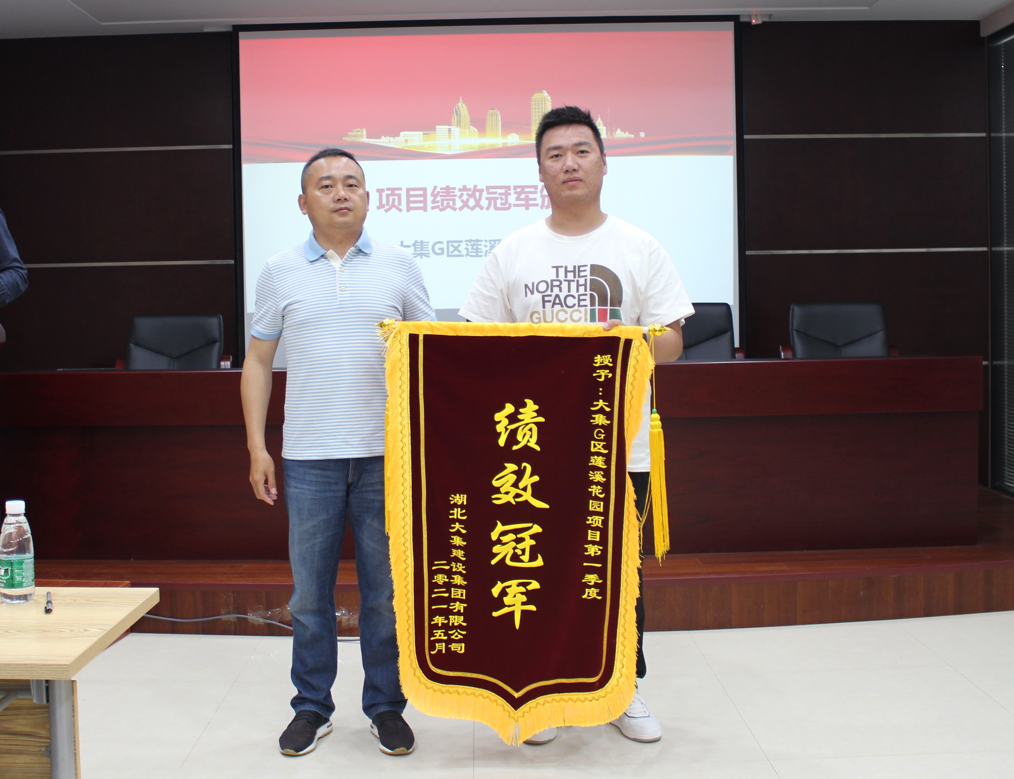 隨后,行政部部長(zhǎng)李漢毛公布項(xiàng)目第一季度績(jī)效考核排名,并由集團(tuán)公司董事長(zhǎng)徐濤為第一季度項(xiàng)目績(jī)效冠軍——大集G區(qū)蓮溪花園項(xiàng)目頒發(fā)錦旗及獎(jiǎng)金。