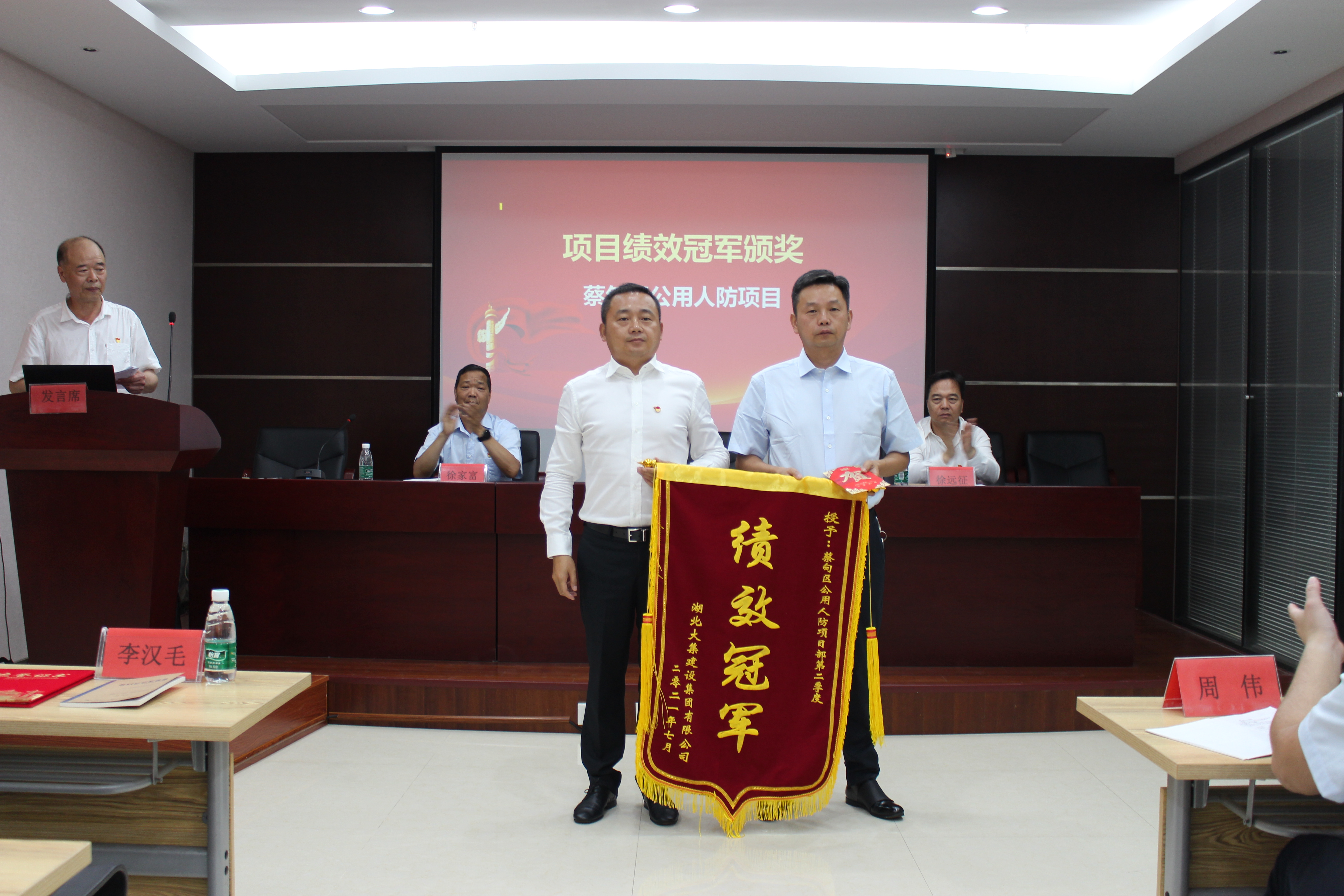 集團(tuán)董事長(zhǎng)徐濤為此次績(jī)效考評(píng)中的冠軍項(xiàng)目——蔡甸區(qū)公用人防項(xiàng)目部頒發(fā)錦旗和獎(jiǎng)金。