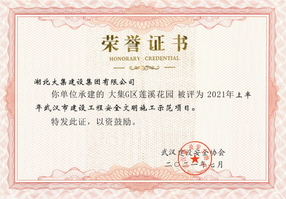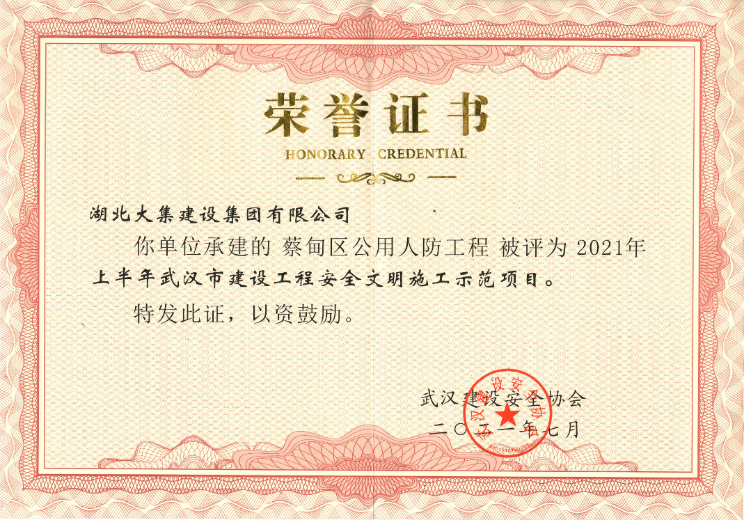 近日,由集團公司承建的“大集G區(qū)蓮溪花園項目”和“蔡甸區(qū)公用人防項目”榮獲“2021年上半年武漢市建設(shè)工程安全文明施工示范項目”稱號。此項榮譽的獲得是對項目安全生產(chǎn)和文明施工管理的充分肯定,也為公司進一步推進安全標準化奠定了堅實基礎(chǔ)。