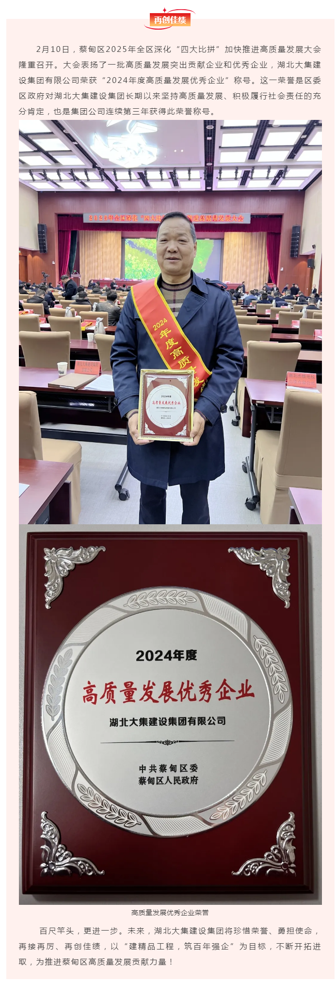 喜訊!湖北大集建設(shè)集團榮獲蔡甸區(qū)“2024年度高質(zhì)量發(fā)展優(yōu)秀企業(yè)”榮譽