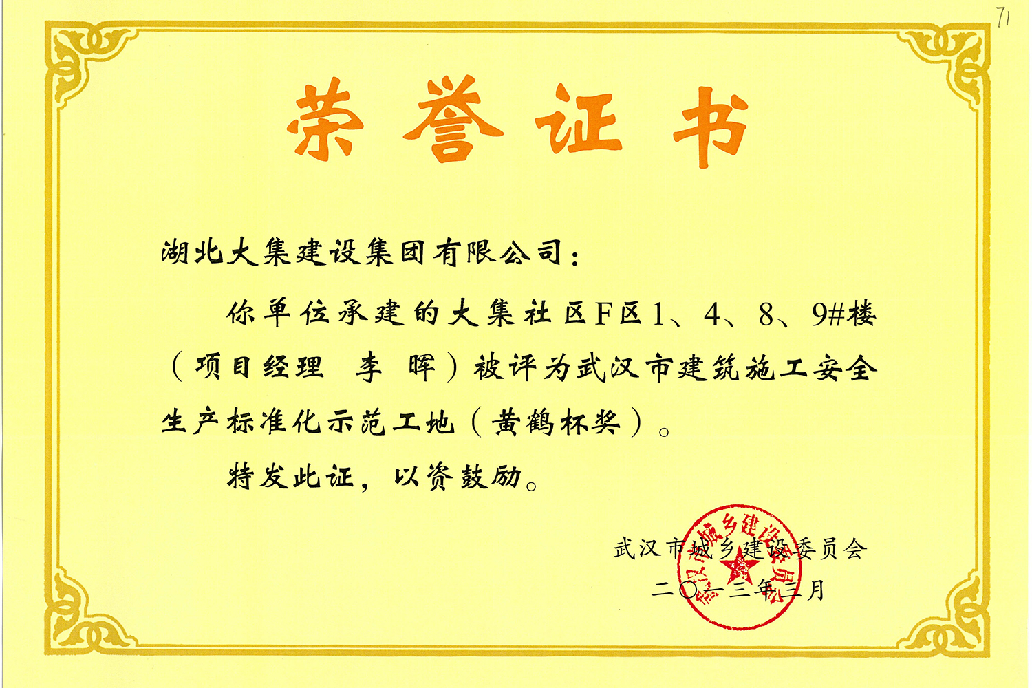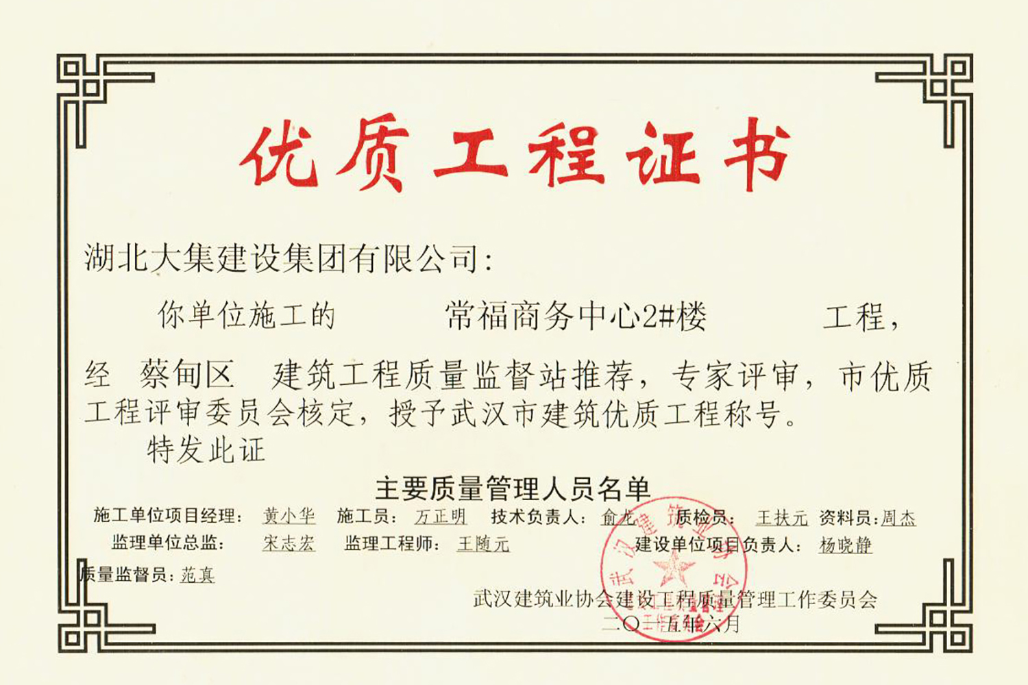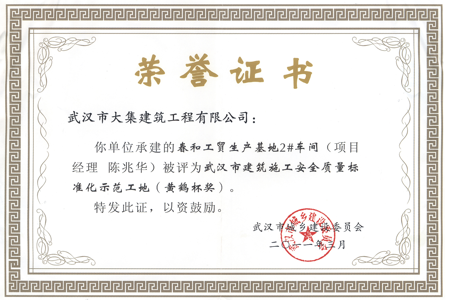 集團(tuán)秉持“安全是紅線,質(zhì)量是品牌,文明施工是形象”的企業(yè)宗旨,不斷加強(qiáng)全面管理,注重提高自身素質(zhì),以完美的履約、優(yōu)良的質(zhì)量、滿意的服務(wù),贏得了信譽(yù)。近年來,湖北大集建設(shè)集團(tuán)先后與中石化集團(tuán)、中鐵上海工程局、中建八局、中鐵十二局、碧桂園集團(tuán)、世茂集團(tuán)、綠地集團(tuán)等央企、國企、地方標(biāo)志性建設(shè)單位合作,先后承建了“碧桂園知音豪庭”項(xiàng)目、“碧桂園光谷云境”項(xiàng)目、“大集G區(qū)蓮溪花園”項(xiàng)目等多個高層住宅小區(qū);承建了世茂龍灣46#、47#、48#地塊、花博匯桃李春風(fēng)二期等多個精品高端別墅群項(xiàng)目;承建了“南湖中學(xué)”、“南湖小學(xué)”、“南湖幼兒園”、“博奧幼兒園”等多個教育配套項(xiàng)目;承建了“孝感英眾超算終端科技產(chǎn)業(yè)園”、“鴻盛華全球航空服務(wù)產(chǎn)業(yè)園”、“盟盛汽車產(chǎn)業(yè)園”、“中原印務(wù)晶毅”等多個具有特殊設(shè)備安裝需求的鋼、混結(jié)構(gòu)工業(yè)廠房項(xiàng)目;承建了“常福商務(wù)廣場”等大型商業(yè)綜合體;承建了后官湖綠道二期、三期,常貴路西延伸段、黃星大道等多條大型道路市政項(xiàng)目;自主開發(fā)了“聚盛晶尚”住宅項(xiàng)目,改善人居環(huán)境,引領(lǐng)綠色棲居新領(lǐng)域;所有工程嚴(yán)格執(zhí)行施工作業(yè)全過程質(zhì)量、安全管理,多個項(xiàng)目被省、市級監(jiān)管單位授予“省結(jié)構(gòu)優(yōu)質(zhì)”、“省安全文明施工現(xiàn)場”、“市結(jié)構(gòu)優(yōu)質(zhì)”、“市安全文明施工示范項(xiàng)目”、“樣板工地”等榮譽(yù)稱號。