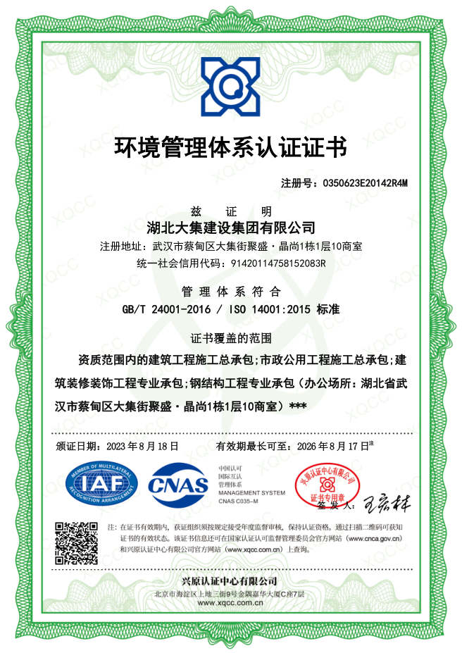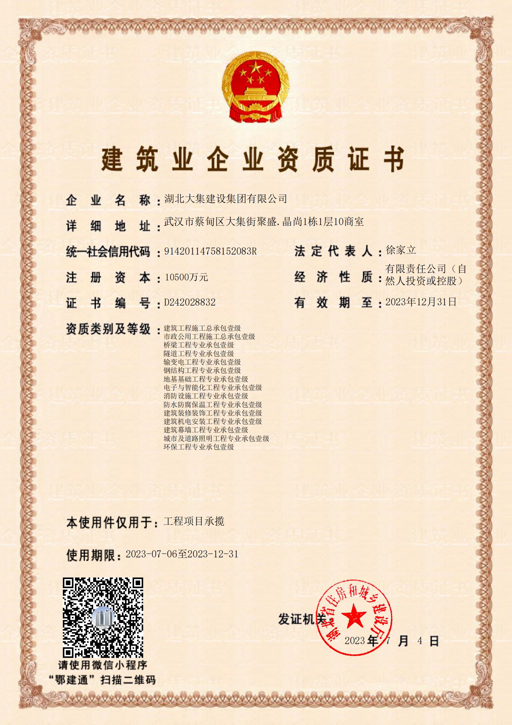 湖北大集建設(shè)集團(tuán)有限公司成立于1990年,注冊資本10500萬元,是武漢市蔡甸區(qū)本土建筑行業(yè)的龍頭企業(yè),在行業(yè)內(nèi)具有一定的品牌影響力。擁有建筑工程施工總承包一級、市政公用工程施工總承包一級、橋梁工程專業(yè)承包一級、隧道工程專業(yè)承包一級、輸變電工程專業(yè)承包一級、鋼結(jié)構(gòu)工程專業(yè)承包一級、地基基礎(chǔ)工程專業(yè)承包一級、電子與智能化工程專業(yè)承包一級、建筑裝修裝飾工程專業(yè)承包一級等多項(xiàng)資質(zhì)。現(xiàn)已形成“建筑施工、園林綠化、文化旅游、房地產(chǎn)開發(fā)與物業(yè)管理”四大產(chǎn)業(yè)格局,并通過了行業(yè)和國家質(zhì)量管理體系、環(huán)境管理體系和職業(yè)健康安全管理體系認(rèn)證,三大安全管理體系日臻完善,是一家綜合力較強(qiáng)的綜合性建筑施工企業(yè)。