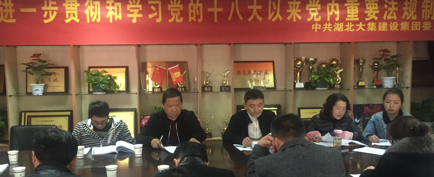 為了深入貫徹落實(shí)黨的十八屆六中全會(huì)精神,增加思想政治教育,加強(qiáng)黨的知識(shí)普及,2016年11月21日下午,湖北大集建設(shè)集團(tuán)黨委組織全體黨員同志在集團(tuán)會(huì)議室集中學(xué)習(xí)《中國(guó)共產(chǎn)黨章程》、《中國(guó)共產(chǎn)黨廉潔自律準(zhǔn)則》、《關(guān)于新形勢(shì)下黨內(nèi)政治生活的若干準(zhǔn)則》、《中國(guó)共產(chǎn)黨紀(jì)律處分條例》等黨內(nèi)文件和重要法規(guī)制度。
